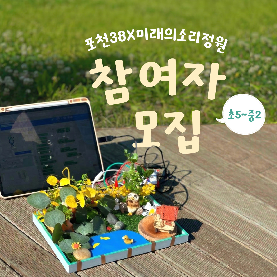 🍀 본 프로그램은 포천문화관광재단, 포천38문화예술창작소, 소리야놀자가 합께합니다 🍀 자연·예술기술이 만나는 생태예술교육포천38 X 미래의 소리정원초5~중2|4회차|포천38문화예술창작소 "사라지는 자연을 소리로 되살리는 시간" 자연의 소리에 귀 기울이고,다양한 생명체와 함께 살아갈 미래를 상상하며나만의 '소리정원'을 만들어보는 시간! 자연을 새롭게 감각하는 4주간의 프로젝트,<포천38X미래의 소리정원> 참여자를 모집합니다🧡 <클래스 개요> 📍 교육대상: 초등 5학년 ~ 중등 2학년📍 교육장르: 자연X예술X공학 창의융합교육📍 소요시간: 120분📍 교육인원: 15명(선착순)📍 교육일정: 4/5~4/26, 매주 일요일 14:00~16:00📍 교육장소: 포천38문화예술창작소 교육실(경기도 포천시 전영로 1429번길 5)📍 교육비용: 무료 🌿 커리큘럼(4회) - 4/5(일) 14:00 1회차 - 사운드워킹 - 4/12(일) 14:00 2회차 - 미래 생명체 탐색 - 4/19(일) 14:00 3회차 - 소리정원 설계 및 제작 - 4/26(일) 14:00 4회차 - 소리정원 완성 및 전시 ✅ 신청방법: 포천38문화예술창작소 홈페이지 신청(홈페이지 ▶ 교육/행사 ▶강좌신청 ▶ 수강신청)